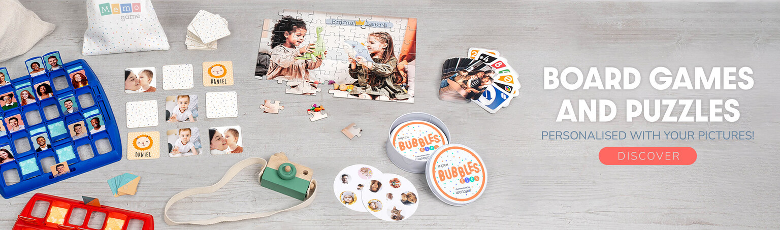 Our catalogue is wide and varied: from keyrings, mugs, puzzles, blankets, towels, phone cases, board games, trophies, canvas prints, cushions or sports balls, among many others. You can design any product from scratch or choose from thousands of personalised designs and themed templates, customisable with your own photos, texts or illustrations for key occasions (Valentine’s Day, Father’s Day, Mother’s Day, Christmas, birthdays, anniversaries, events, weddings), as well as gifts for men, women, children or any age, and categories based on interests, hobbies or professions.